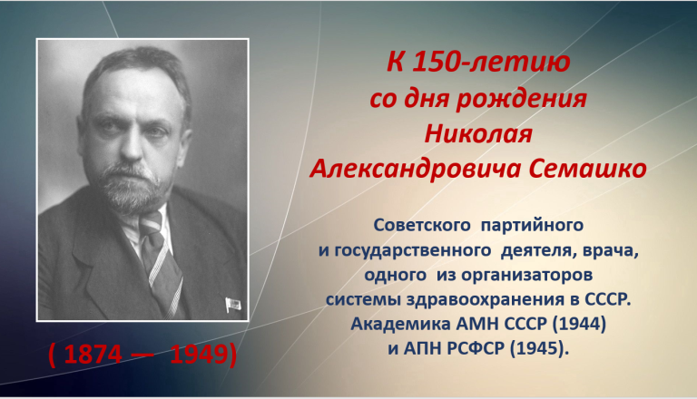 В 2024 году празднуется 150-летие со дня рождения выдающегося государственного и политического деятеля, одного из основоположников системы отечественного здравоохранения Николая Александровича Семашко. Вклад Н.А. Семашко в историю отечественного здравоохранения остается значительным и по сей день. Изучение его жизни и деятельности на основе архивных данных и опубликованных научных работ продолжает привлекать исследователей, стремящихся объективно осветить сложный период развития страны и почтить память выдающихся исторических личностей.